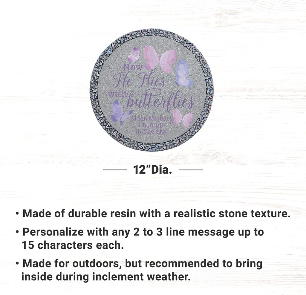 - THEIR SPIRIT LIVES ON: A soothing message, “Now he flies with the butterflies” (pictured) or “Now she flies with the butterflies,” appears on each garden stone. This elegant tribute to a loved one will help remember their spirit and lift your heart.